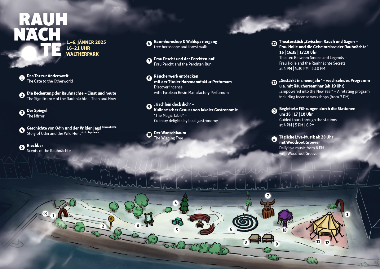 Die Rauhnächte sind eine Zeit der Transformation und Besinnung, in der Besucher eingeladen werden, tief in die Verbindung zwischen Natur, Tradition und dem eigenen Selbst einzutauchen. Im Rahmen dieses besonderen Erlebnisses führt ein thematischer Rundgang durch 12 interaktive Stationen, die sowohl alte Bräuche als auch moderne Perspektiven aufgreifen. Die 12 Stationen stehen dabei jeweils für eine der 12 Rauhnächte.